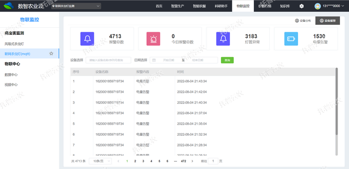 4、風吸式茶園殺蟲燈支持手機App與Web端控製,具有豐富的狀態信息展示,足不出戶就可以了解一切,如地理位置、設備編號、基地名稱、物聯網卡卡號、剩餘流量、卡有效期、GSM天線連接是否正常等故障報警信息。可遠程控製、查看設備的當前工作狀態、信號強度、電量使用等情況。