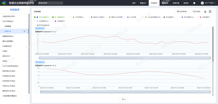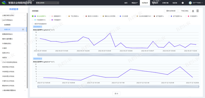 7、配備“數智農業雲”平台:植物光合作用測定儀聯網狀態下,可手動將測量數據上傳到物聯網4.0雲平台,用戶登錄賬號即可查看,可在雲端對實驗數據進行管理和分析,支持對比分析各項光合指標,支持圖表2種展示形式。