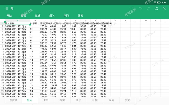 2、全彩色觸摸屏:智能葉麵積測量儀采用11寸高清全彩觸摸屏,1300萬像素,拍照後軟件自動計算葉麵積,周長,葉長,葉寬,蟲洞個數並同屏顯示結果。