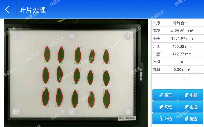 7、帶有手動修正功能, 智能葉麵積測量儀可進行剪切、修補、自動切葉柄、選取顏色分析麵積等功能,確保測量結果的高精度。